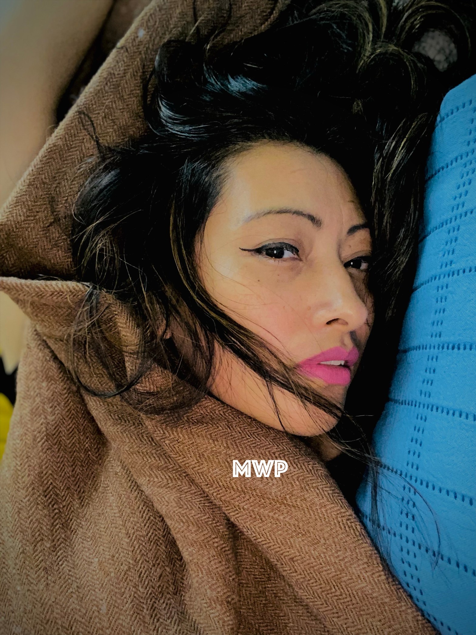 Pink lips resting on blue dreams. Brown eyes sleepless and alert. An obsession wrapped in Afghan blankets keep my hair in disarray. Inside the sheets of an unmade bed an idea persists. My love, you disquiet my female mind, now you must materialise in my arms and cease being a daydream. Oh lethargy! I need to get up.