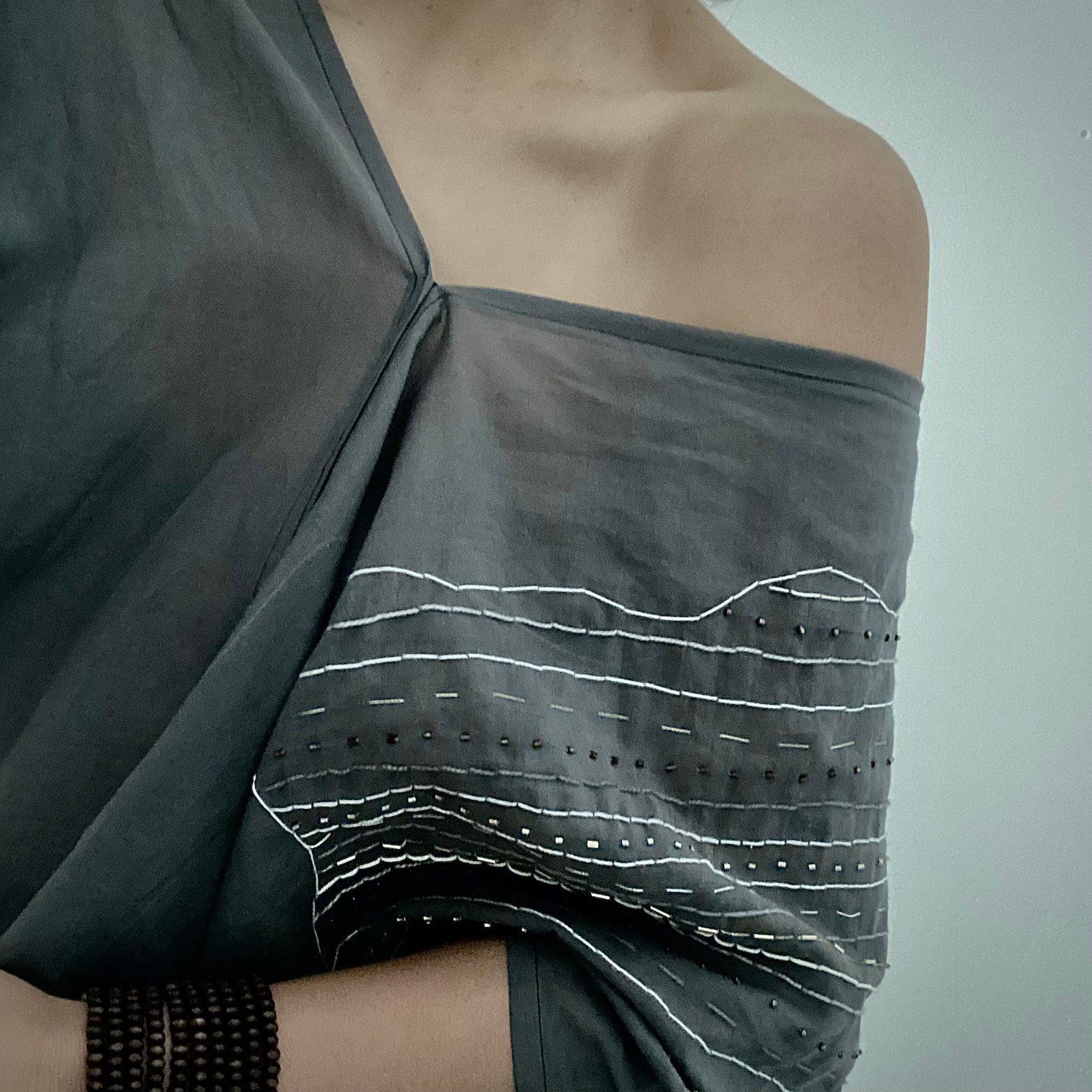 I dress myself with love. A tunic in a subtle shade of gray embroidered with threads -some white, some gold- all of different nostalgic tones. Every stitch is a memory impressed in me. Every row is a chain of caresses you delineated on my skin. I dress myself with a love that embellishes me.