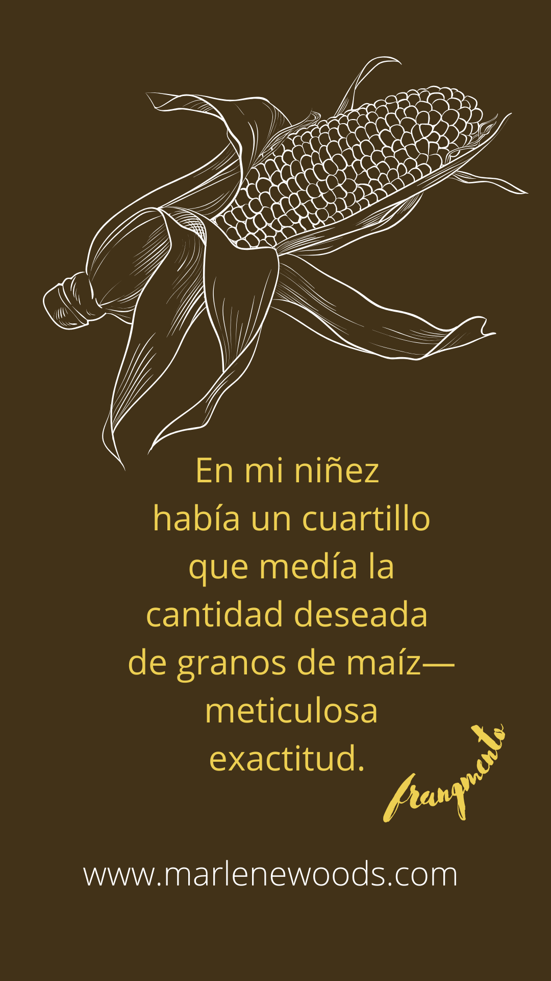 ¿Dónde deposito el exceso de mi amor por él? En mi niñez había un cuartillo que medía la cantidad deseada de granos de maíz— meticulosa exactitud. Necesito un cuartillo intangible para contener los granos de mi amor o la cantidad de mi deseo por él, objeto amoroso, pues este afecto continúa derramándose de mi hinchado corazón.