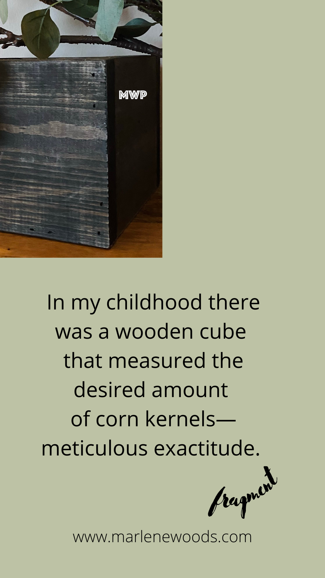 Where do I deposit the excess of my love for him? In my childhood there was a wooden cube that measured the desired amount of corn kernels— meticulous exactitude. I need an intangible cube to contain the kernels of my love or the amount of my desire for the amorous object, since this affection continues to spill out of my swollen heart.
