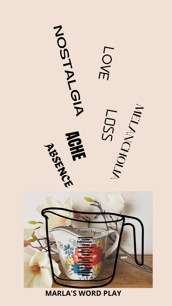Yesterday it pained me to miss you. Your absence was a hole deep dark empty and unfillable where the echo of my love for you resounded; it was deafening. If that missing you were measurable, my measuring cup would over spill. Today missing you is a rupture in a pair of jeans, they could remain torn, but I sew it shut with needle and thread to appear presentable. If that missing you were measurable, my measuring cup would be full for it now fits like when I measure milk to make the cake I accompany my coffee with. I finally sit down to eat my cake and sip my coffee when irremediably, I think of you.